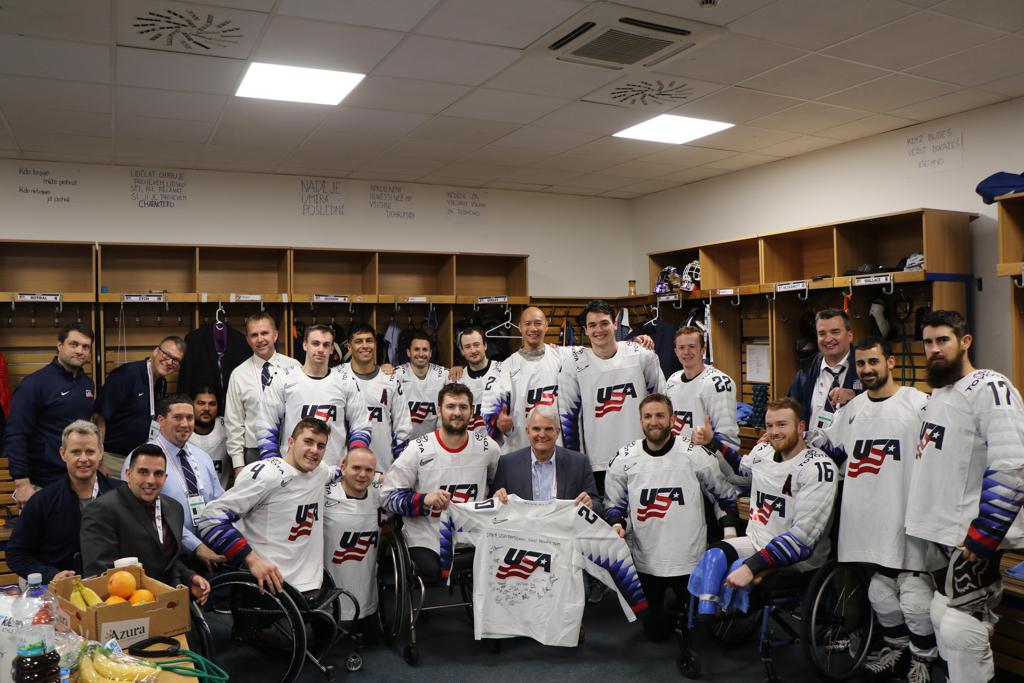 Following last night's victory, the U.S. received a locker room visit from Stephen B. King, U.S. Ambassador to the Czech Republic. King, who was confirmed by the Senate on October 5, 2017, hails from Madison, Wisconsin, where the U.S. National Sled Hockey Team has trained the last few years due to strong relationships developed by the late head coach and long-time Wisconsin Badger men's ice hockey coach, Jeff Sauer.