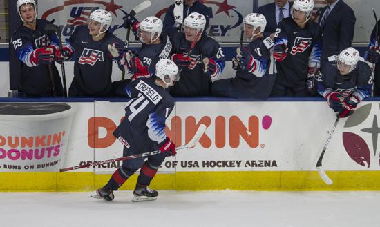 Team USA needed just 26 seconds into the third period to reclaim the lead. After collecting the puck below the goal line,Jack Drury (Winnetka, Ill.) crept towards the slot before sending a low shot on goal that forced a rebound Joel Farabee (Cicero, N.Y.) was able to one-time into the empty net.
