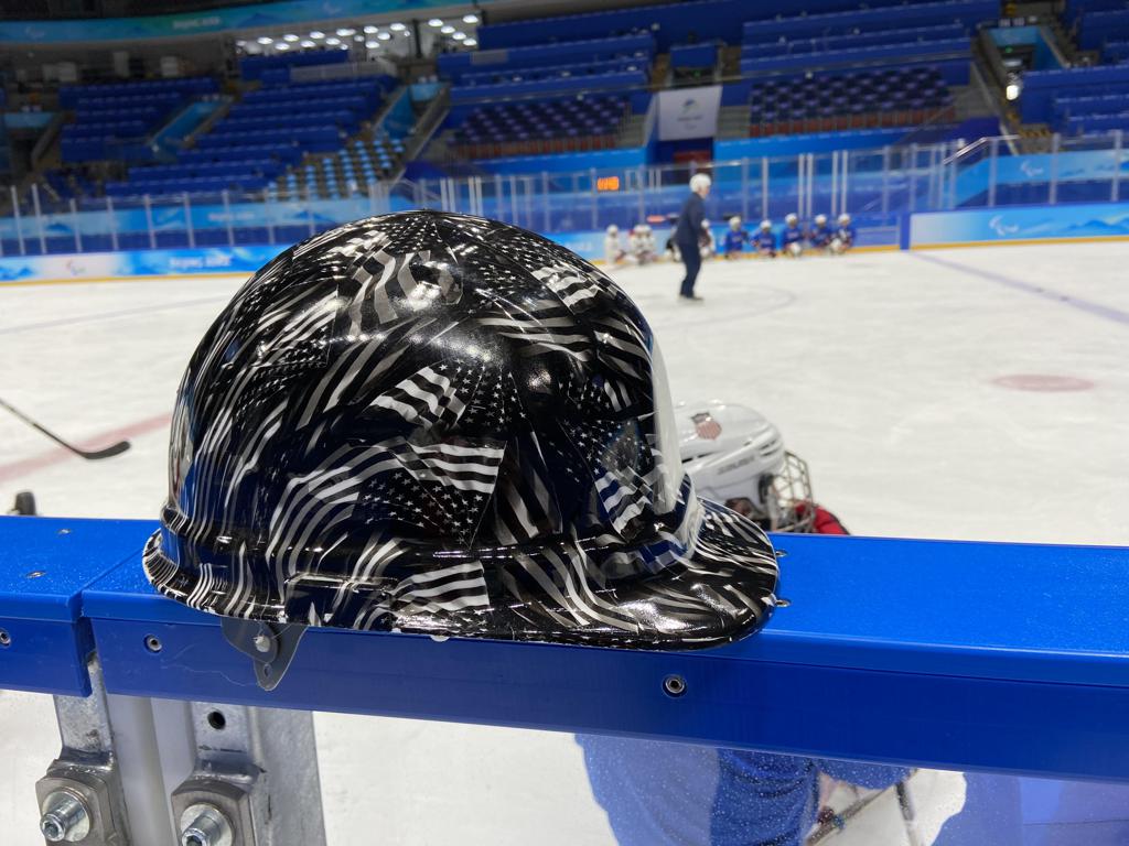 Griffin LaMarre (Haverhill, Mass.), who is making his Paralympic debut in Beijing, came up with the idea to award the “Grinder of the Day” a hard hat. He said his club team, the Northeast Passage Wildcats, had done something similar a few years ago. At the end of every practice, players and coaches huddle up for the announcement, and everyone cheers and stick taps for the recipient of the hard hat.