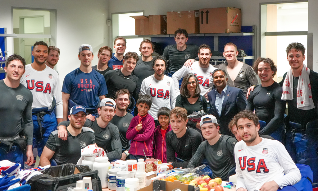 Guatam Rana, the U.S. Ambassador to Slovakia, his wife Alexsa and their two young sons were greeted by Team USA in the lockerroom following last night’s game against Slovakia in Bratislava. Rana shared he is a big hockey fan and cheers for the New Jersey Devils and also the New York Islanders. He reflected how great it was for the team to be in Slovakia and shared with the players the importance of representing their country.