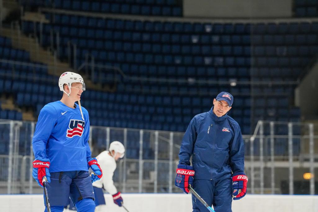 Both Alex Nedeljkovic and Gavin Brindley arrived today. Team USA’s roster is now full with the allotted 25 players … Team USA had a 50-minute practice session today that started at 11:40 a.m. at Ostravar Arena … The U.S. will play four its first five games in the world championship at 8:20 p.m. … Dominik Kafka, who is from Czechia and previously played for the professional team here, is Team USA’s host. Kafka is integrated into Team USA and is the conduit between the local organizing committee and team … Brian Mudryk, Brian Engblom and Claire Hanna, who are calling Team USA’s games on the NHL Network from Ostrava, visited with U.S. head coach John Hynes and selected players following practice today.