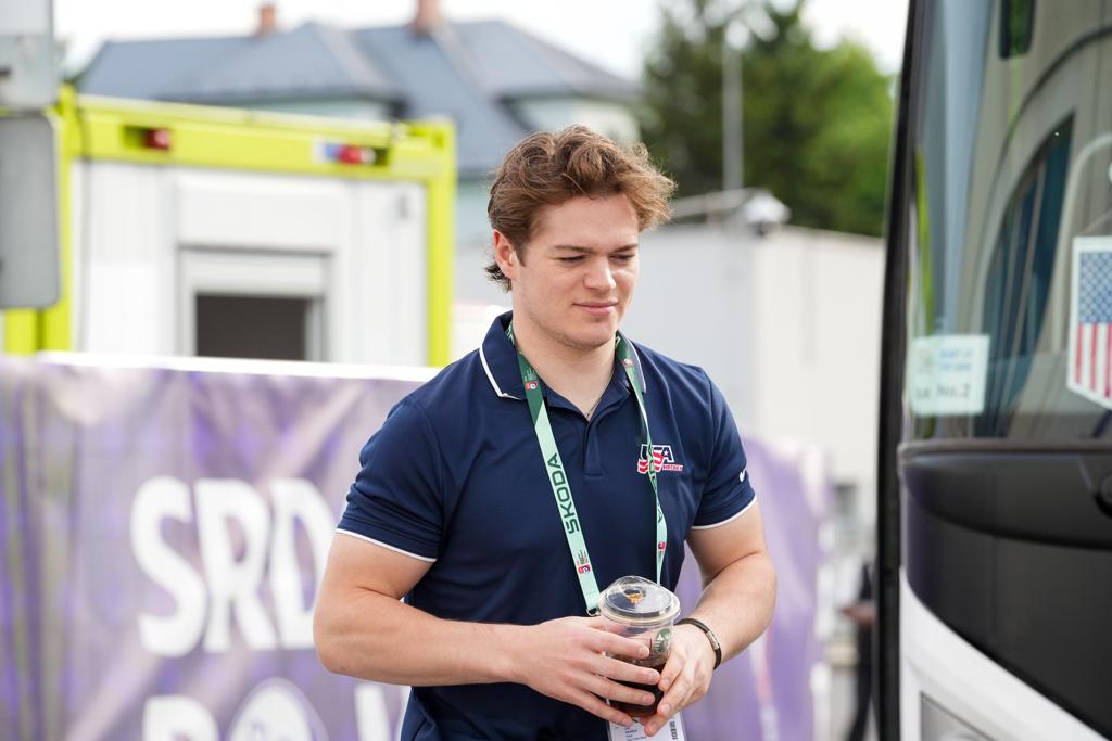 U.S. captain Brady Tkachuk did an interview today from the team’s hotel with CT24 News Channel, which is distributed throughout Czechia. The residents of Ostrava are excited to have Team USA here for the preliminary round … After a day of rain yesterday, the weather was back to sunshine and 70s today … Scott “Scooter” Aldrich, who is part of Team USA’s hockey operations staff and a long-time employee of USA Hockey, has his own reserved parking space directly in front of the team’s hotel.