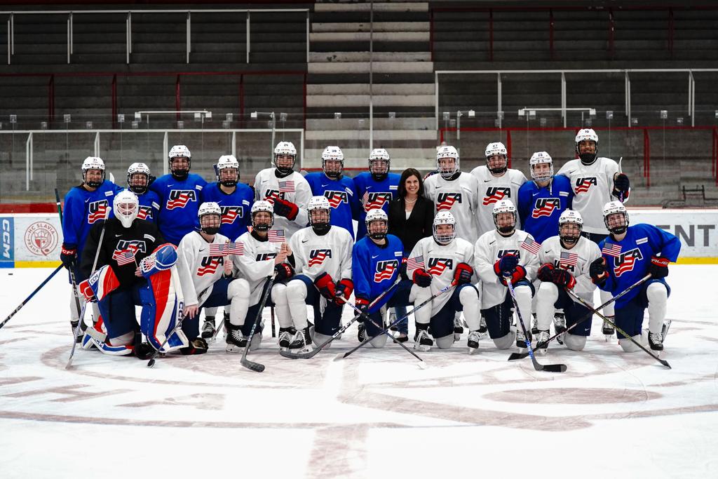 Team USA welcomed a special visitor to practice today, the U.S. Embassy to the Czech Republic’s Chargé d´Affaires Christy Agor. Agor, along with members of the embassy staff watched practice for a few minutes before chatting with the team, officially welcoming them to Czechia. The Embassy staff was also excited to have Team USA in town and are looking forward to cheering the U.S. as the tournament begins next week.