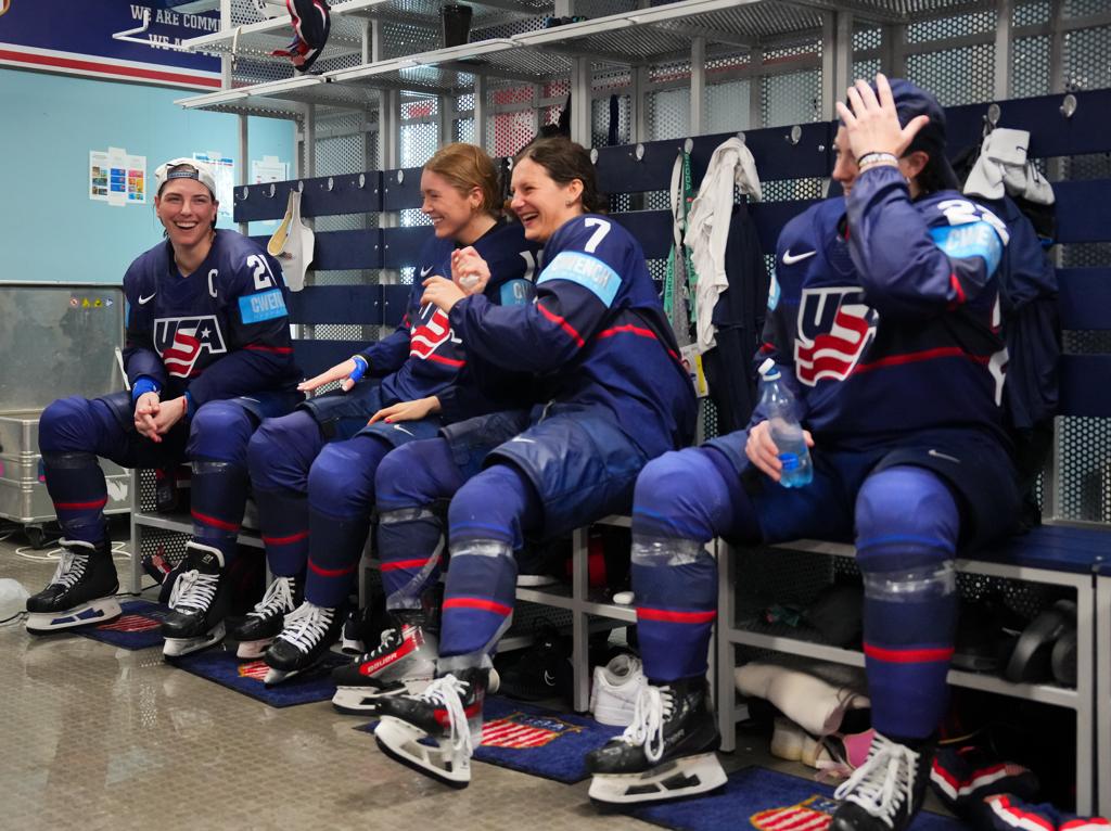 It’s been a week of birthdays here in Czechia for Team USA! First, Alex Carpenter celebrated her 31st birthday on Sunday (April 13), while Abbey Murphy rang in her 23rd on Monday (April 14). The team decorated the meal room with party hats, balloons and Hawaiian leis. They also serenated the pair during each of their birthdays, with Carpenters coming in the locker room following Sunday’s win over Canada.