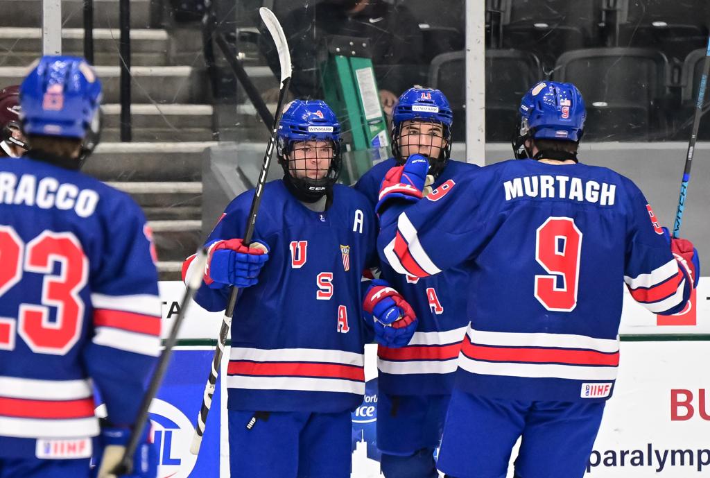 The U.S. skated past Latvia, 6-3, in quarterfinal play Wednesday (April 30). Cullen Potter (Minneapolis, Minn.) opened the scoring early in the first period, followed by Richard Gallant (Concord, Mass.) and Jack Murtagh (East Greenbush, N.Y.) to give the U.S. a 3–0 lead. Latvia answered with two power-play goals in the second, cutting the deficit to one. Asher Barnett (Wilmette, Ill.) responded with a shot that bounced off the boards and the Latvian goalie to make it 4–2. LJ Mooney (West Mifflin, Pa.) added a goal in the third, and Potter sealed the win with an empty-netter.