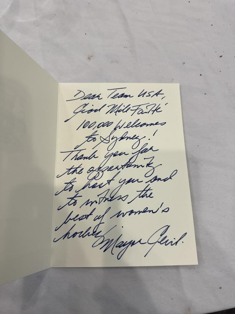 When the team arrived to its hotel late yesterday, their meal room was stocked full of surprises to help welcome Team USA to Sydney. One of those surprises was a handwritten letter from Clarke Cecil, the mayor of Sydney, Nova Scotia. Check out the note and official seal below!