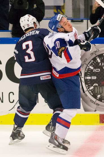 With the 3-0 lead, Team USA started a parade to the penalty box that saw four consecutive U.S. penalties and led to two Slovakian power-play goals. A large Canadian-heavy crowd awoke and cheered loudly as momentum switched away from the Americans. Gillies was, again, called on to steady the game.