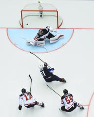 Team USA cut Canada’s lead to one just 1:36 later when Anders Lee (Edina, Minn.) skated in on goal and fired a wrist shot over the right shoulder of Darcy Kuemper. The play started in the neutral zone where Tage Thompson (Milford, Conn.) dished the puck off the wall to Lee who skated down the ice for a two-on-one opportunity with Neal Pionk (Germantown, Minn.) before shooting and scoring Team USA’s first goal of the tournament.